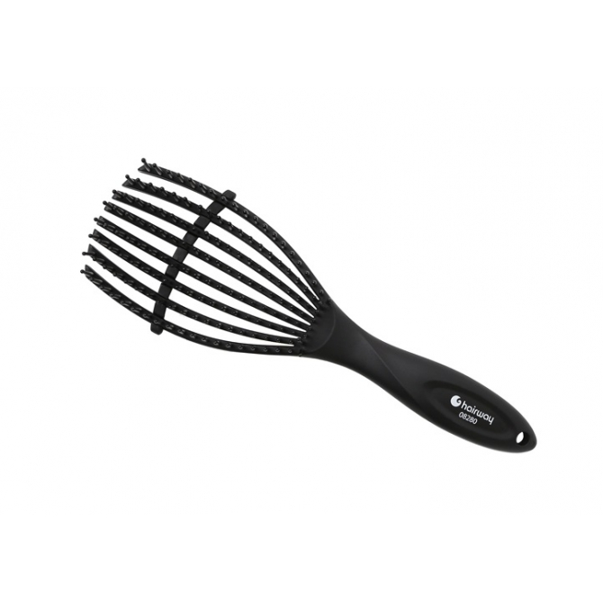 Щётка изогнутой формы с пластиковыми штифтами для эффективного расчёсывания волос и бережного массажа кожи головы. Благодаря своей продуваемой форме она идеально подходит для укладки феном, обеспечивая быструю и равномерную сушку.